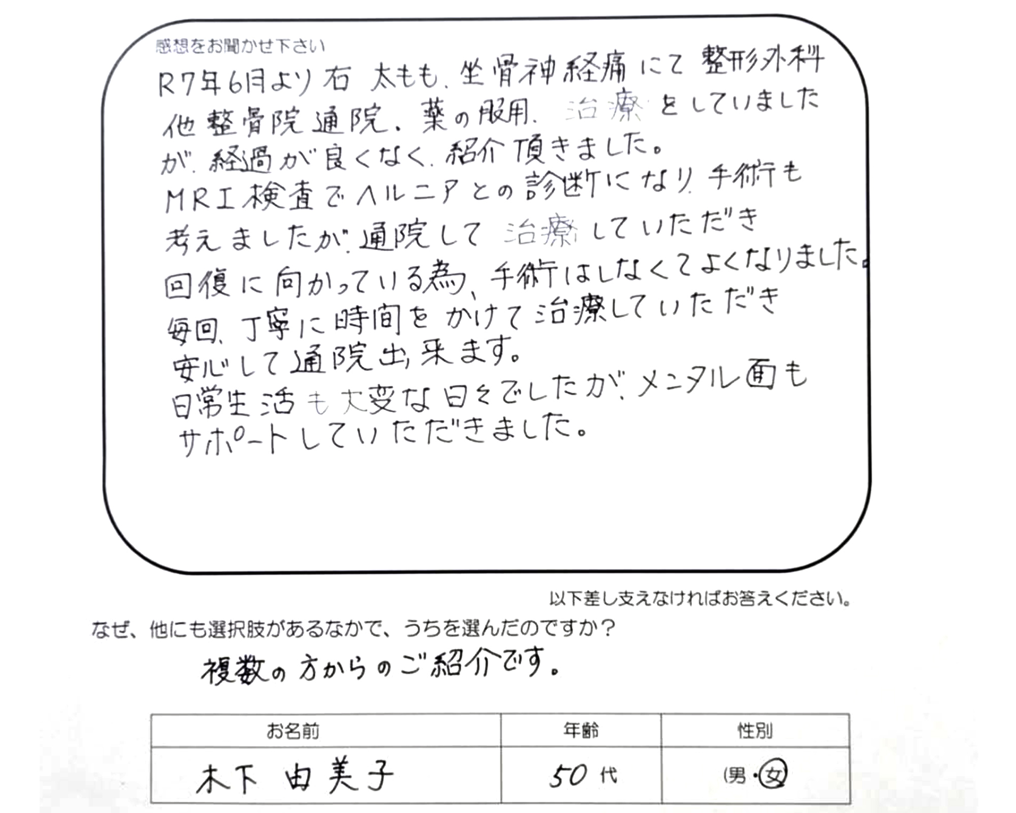 R7年6月より右太もも、坐骨神経痛にて整形外科他整骨院通院、薬の服用、治療をしていましたが、経過が良くなく、紹介頂きました。MRI検査でヘルニアとの診断になり、手術も考えましたが、通院して治療していただき回復に向かっている為、手術はしなくてよくなりました。